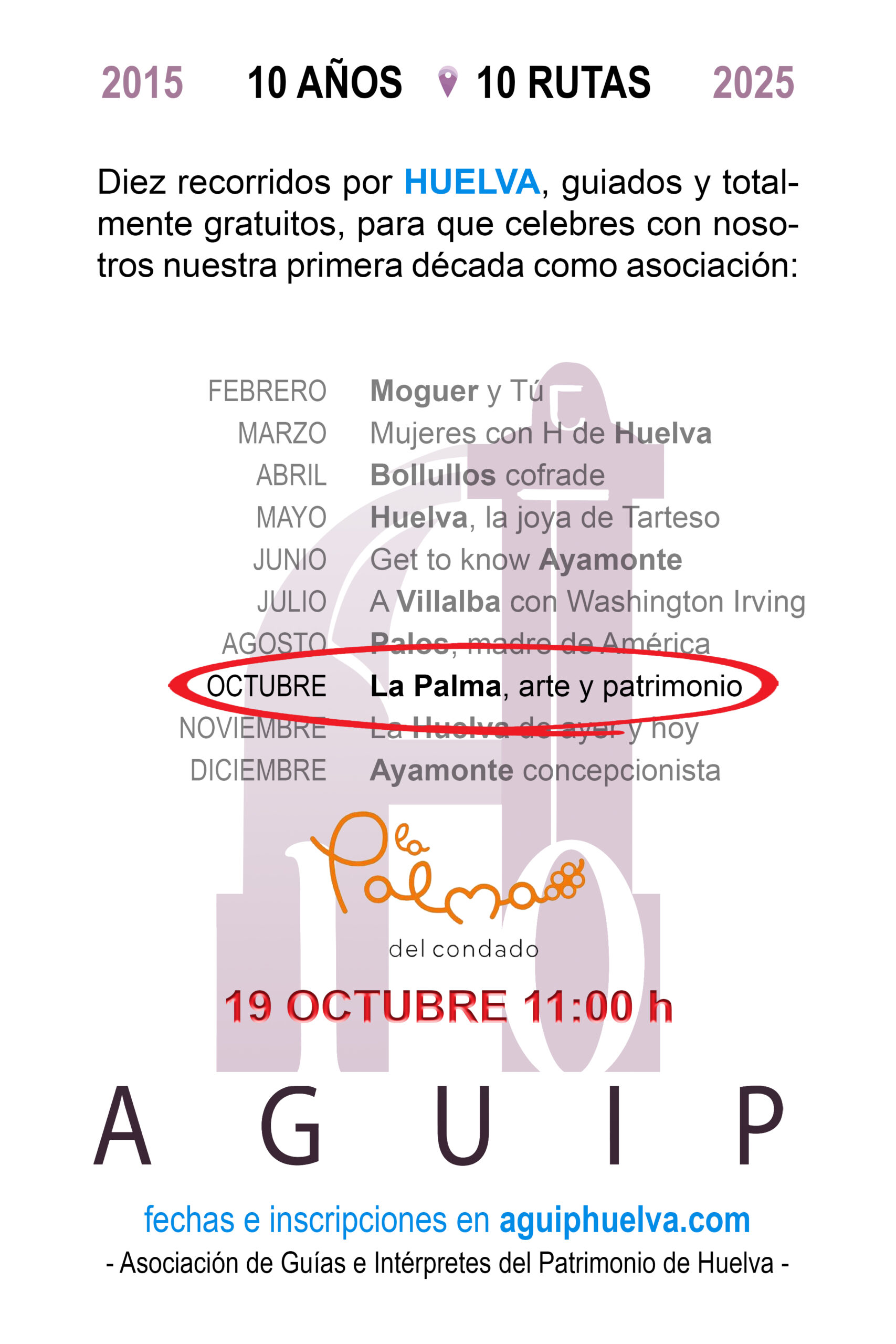Vamos, que no tienes excusa para no reservar el próximo 19 por la mañana. Verás que bonita es La Palma. Regionalista, vinatera, artista, orgullo del viejo Condado de Niebla. Y, si encima resulta que la ruta es GRATIS. Apaga, y vámonos. Eso sí, tienes que reservar a través del formulario que verás más abajo. Recuerda que es una actividad enmarcada en el X Aniversario de AGUIP Huelva, en colaboración con el Área de Turismo del Ayuntamiento de La Palma.
